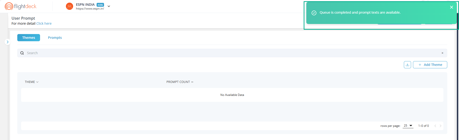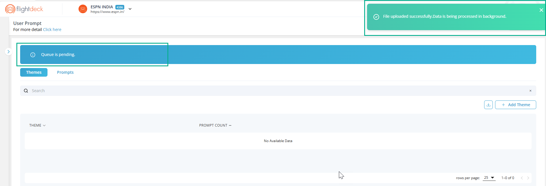 Once uploading a CSV file encoded in UTF-8, it will be in queue of processing on background to generate prompt as per our core inputs i.e. (demographic, thematic cluster and funnel stage).
