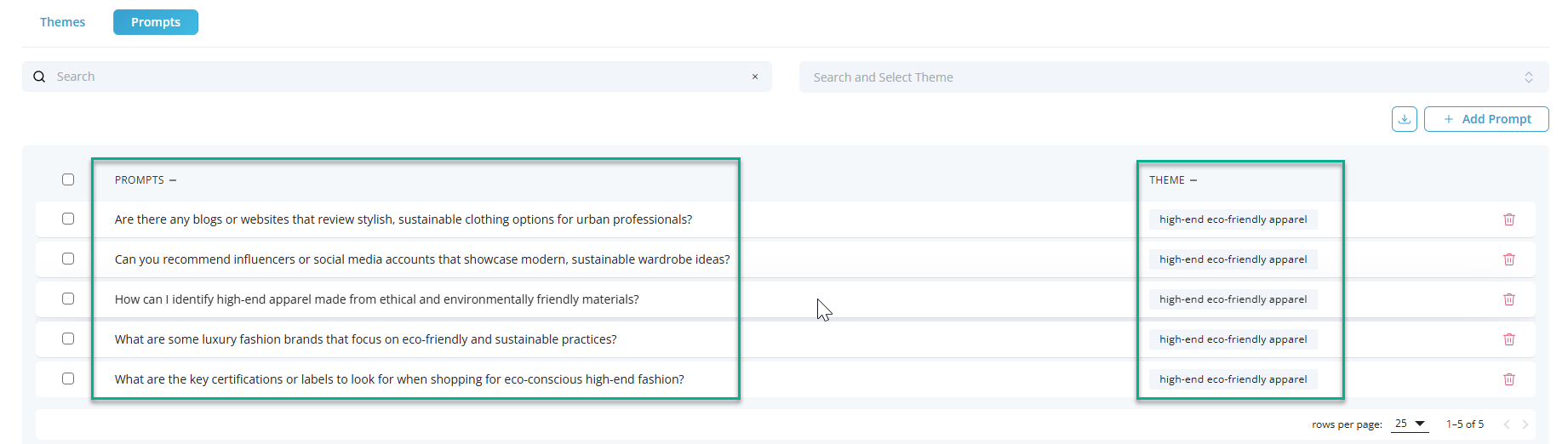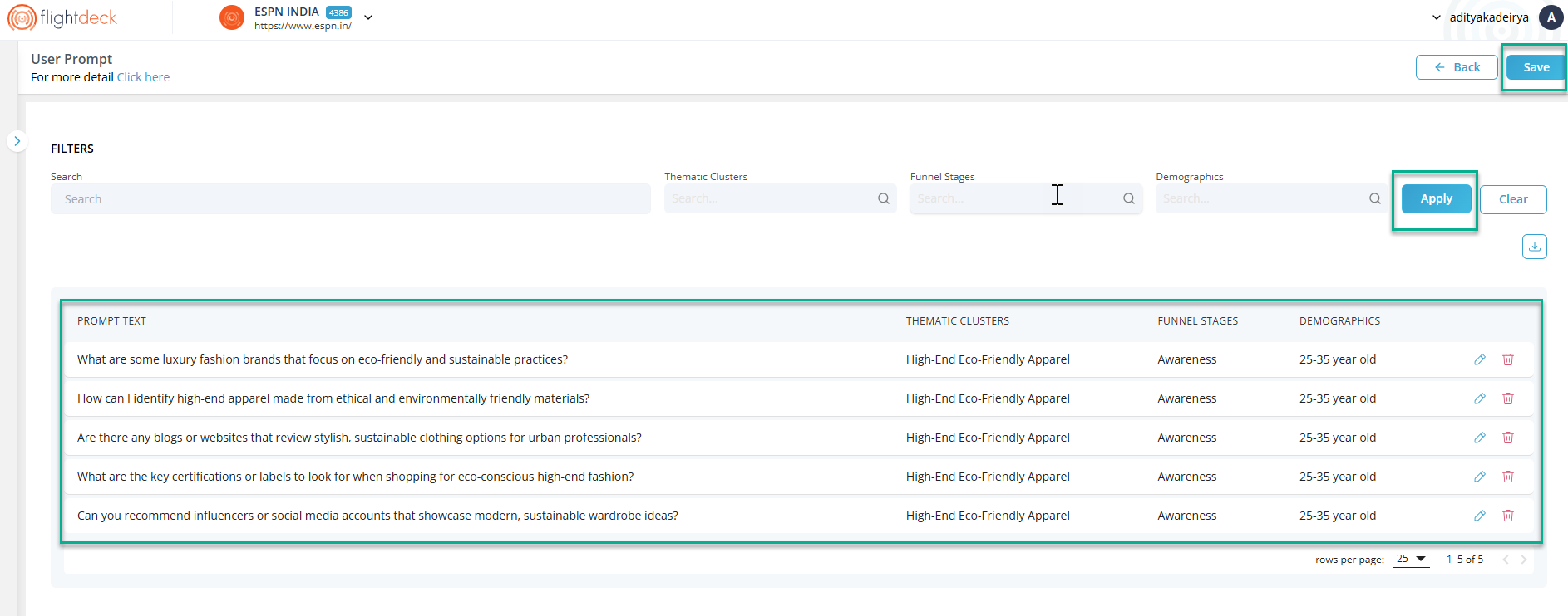After clicking on View Prompt Text button, it will redirect to the page where filters regarding core inputs like thematic clusters, funnel stages and demographics are available. Applying those multi filter search will filter out the result as per desired. And we must Save in order to reflect the generated Prompts and Themes.
