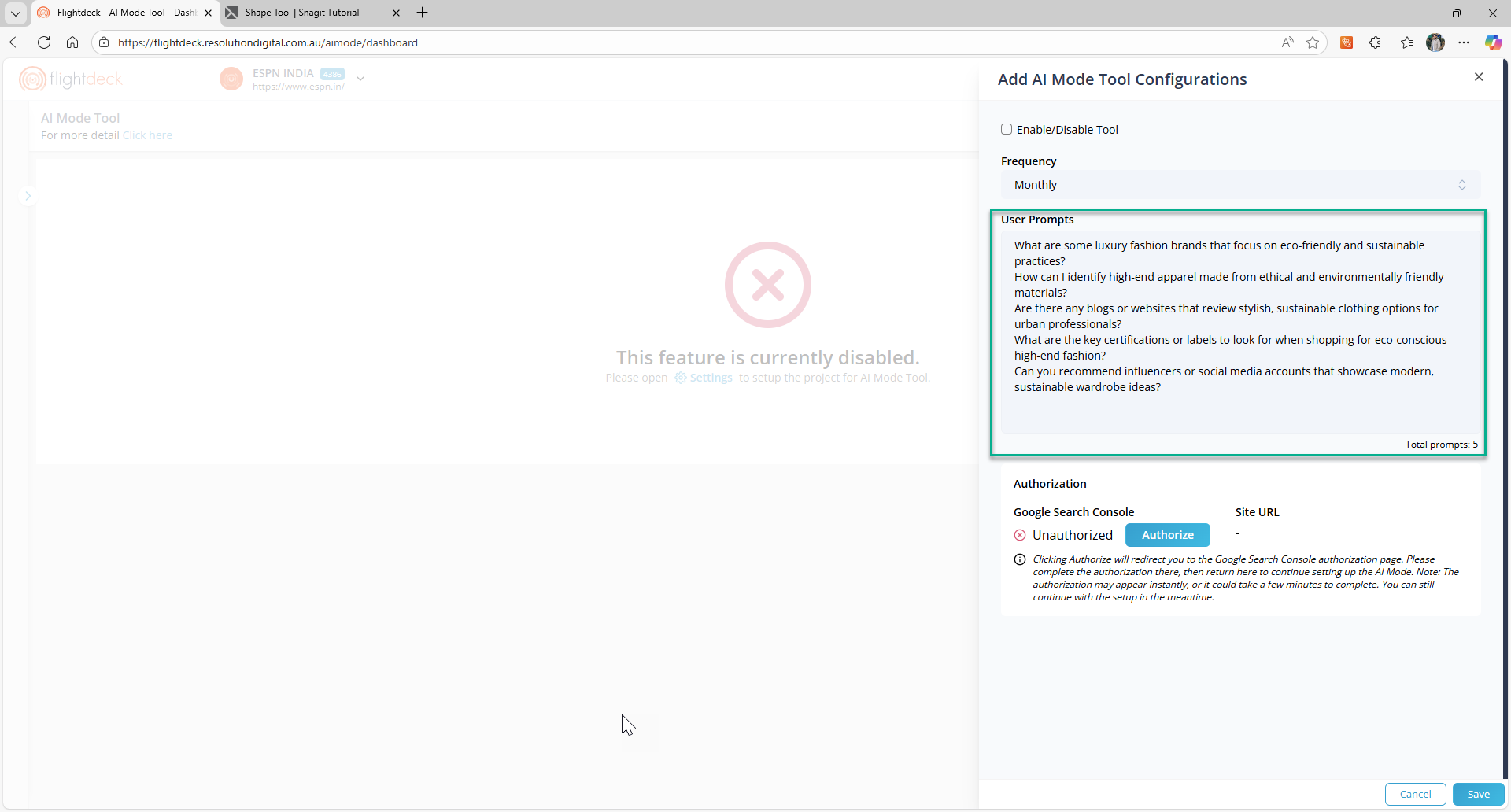 Following the steps, it shows an AI Mode Tool Configurations where all the generated User Prompts are visible.