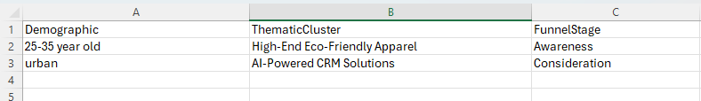 Thematic Cluster: The general category or theme of the client's products (e.g., "High-End Eco-Friendly Apparel," "AI-Powered CRM Solutions").