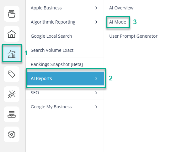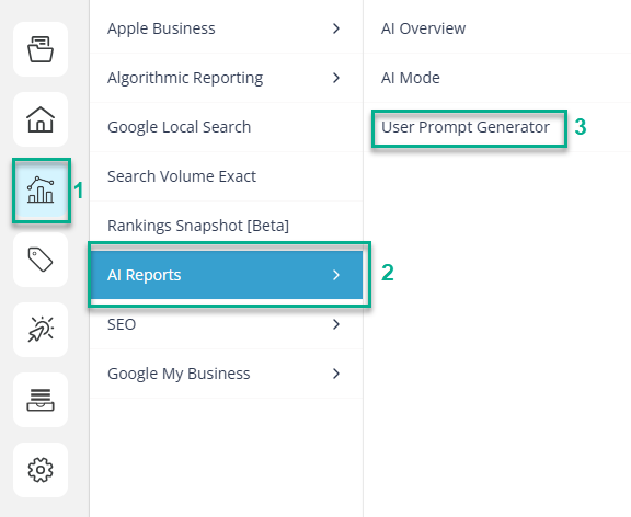2. Click on AI Reports menu item. 3. Click on User Prompt Generator menu item. |